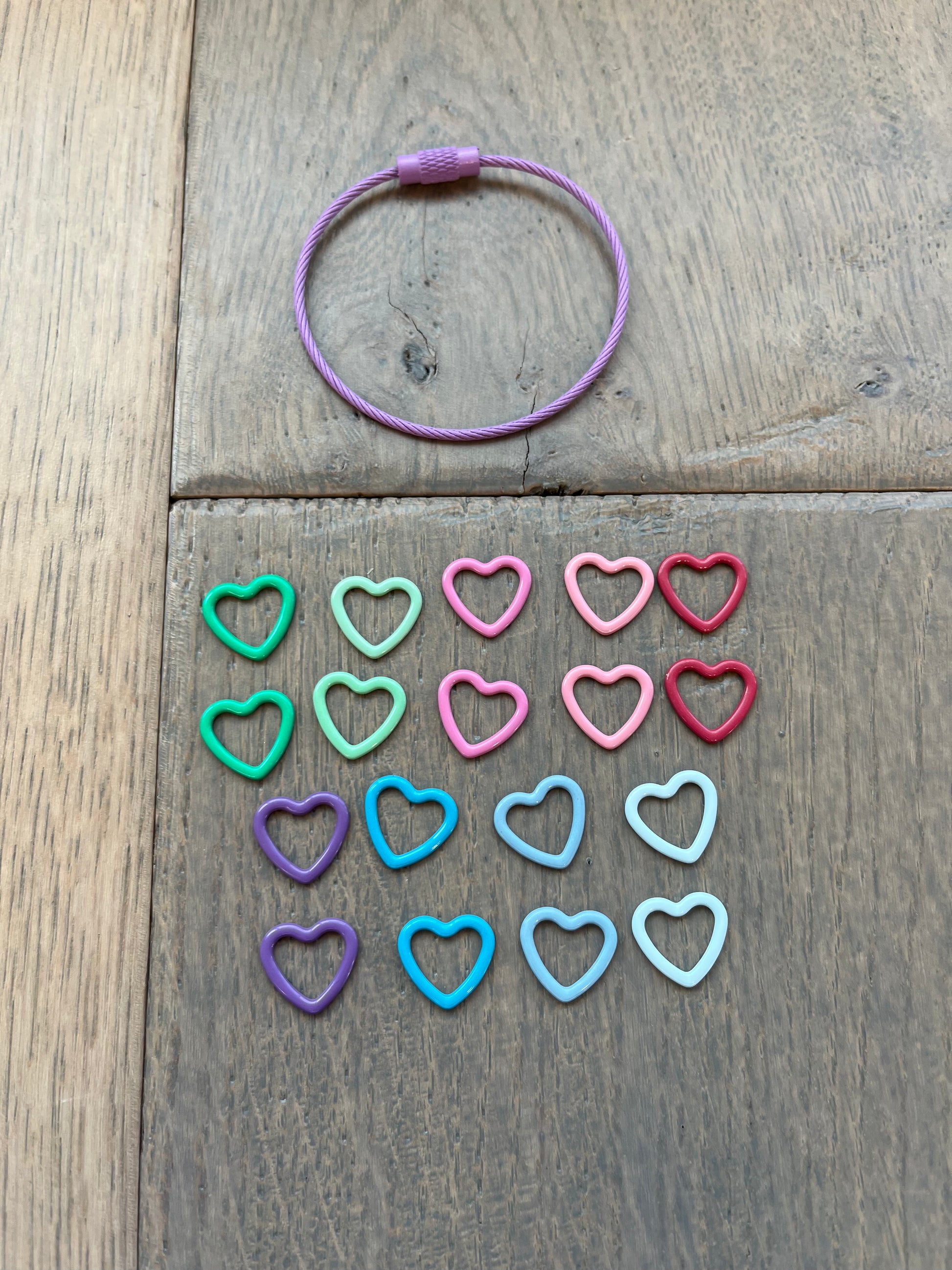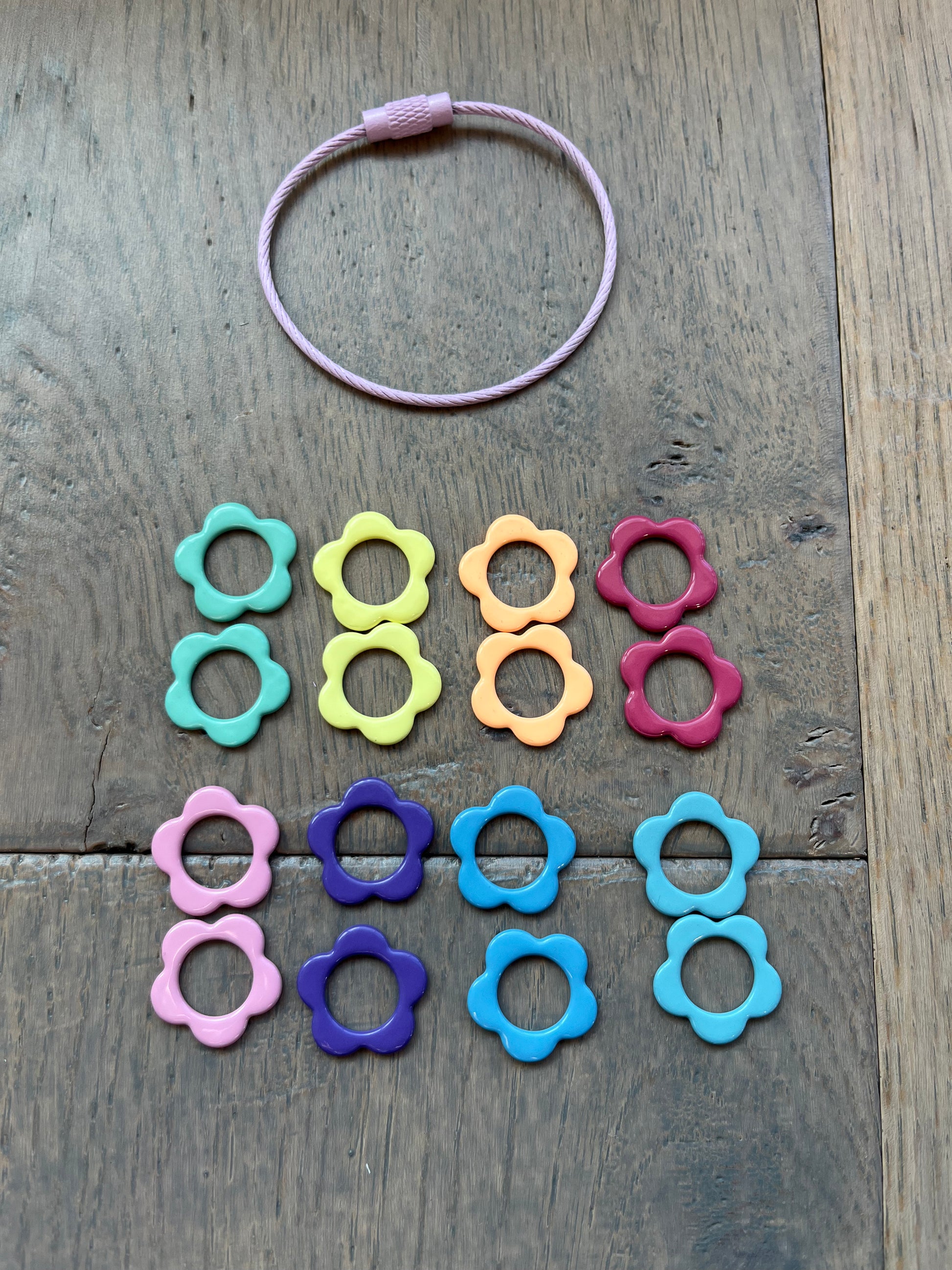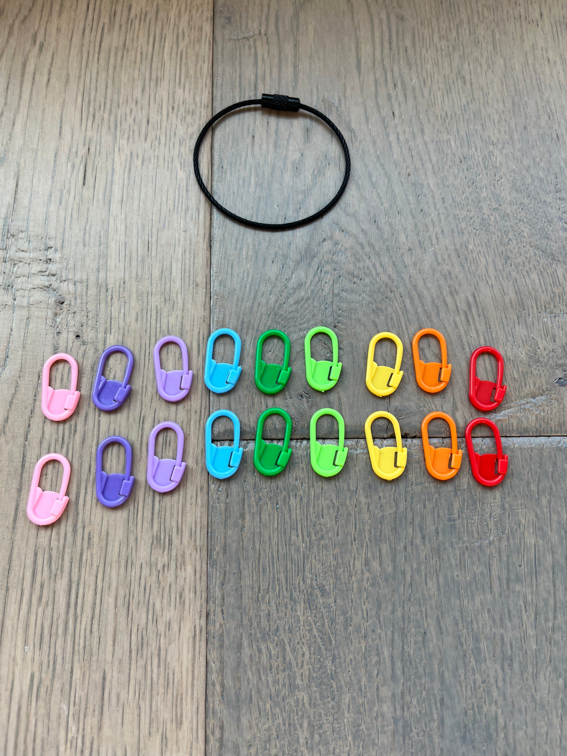 These sets have 15-18 stitch markers and have a easy and handy ring to hold them on!
