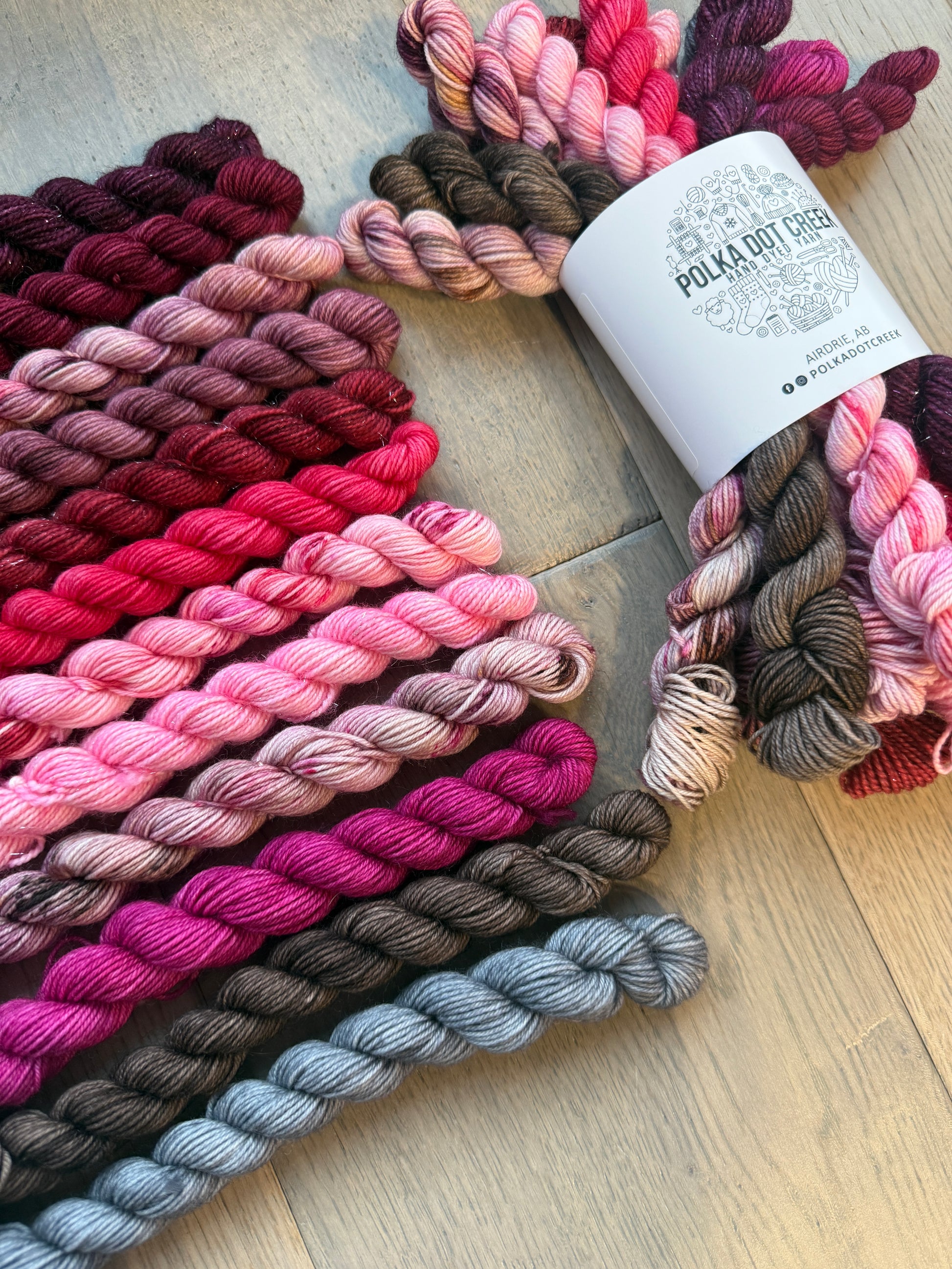 10-12 gr mini skeins, 10 grams each, 46 yards each